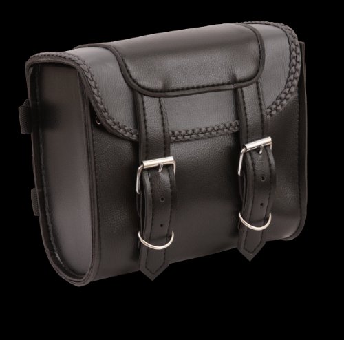 First Manufacturing FIBAG8501 Black Braided Bar Bag features a diameter that measures 10 1/4 inches x 8 3/4 inches x4 3/4 inches. It has a bag for small items and tools. It can be attached to the sissy bar. It has two adjustable belts. It has easy clips for quick access. It has braided detail with a carrying handle on top.